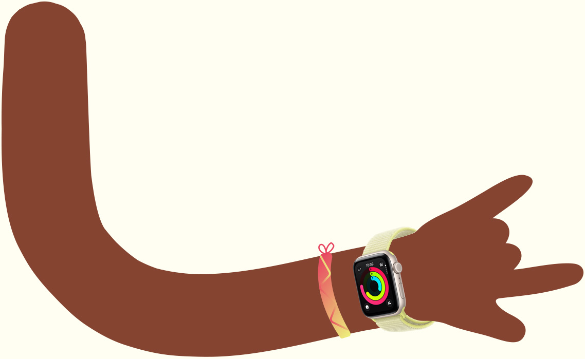 رسم توضيحي لمعصمي طفلين يرتديان ساعة Apple Watch SE 3، ويد شخص بالغ تحمل جهاز iPhone 17‏