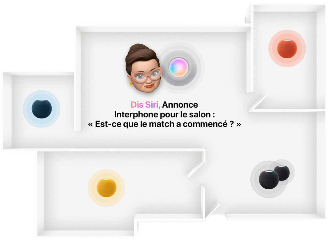 Plan d’une maison. Chaque pièce est équipée d’un HomePod ou HomePod mini. Un personnage Memoji est en train de parler. Certaines enceintes sont mises en évidence.
