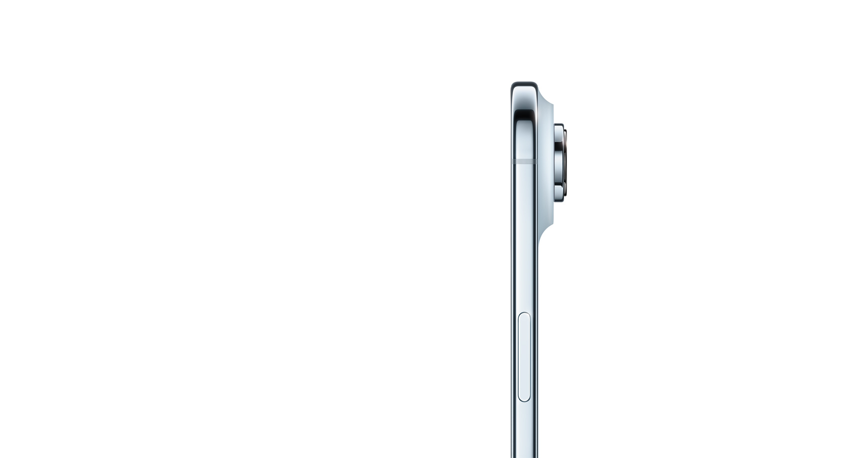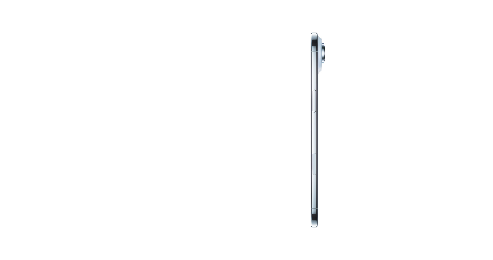 iPhone Air tenu entre un pouce et un index, côté, coloris bleu ciel, profil fin, système caméra Fusion, boutons : latéral, Commande de l’appareil photo A thumb and forefinger holding iPhone Air, side exterior, Sky Blue color, thin profile, Fusion camera system, buttons: side, Camera Control
