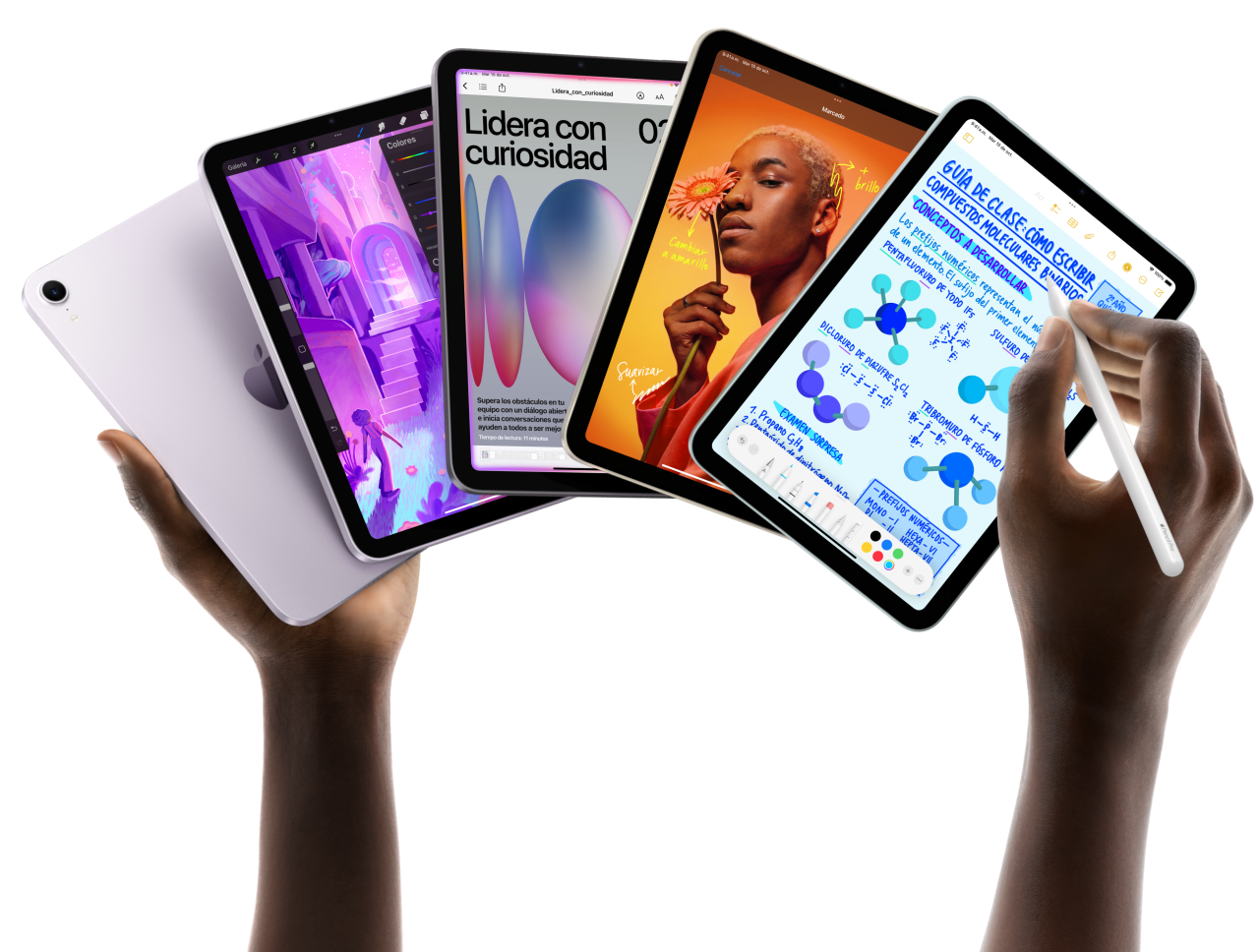 Las manos de un usuario sostienen cinco modelos de iPad mini formando un abanico. Un modelo muestra la cámara trasera y los otros cuatro muestran la parte frontal. Se usa un Apple Pencil Pro para tomar notas.