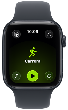 Conoce el Apple Watch Tres modelos de Apple Watch: el del centro en color natural muestra mediciones cardiacas de un entrenamiento de carrera en curso; el de la derecha en negro azabache muestra un Genmoji; y el de la izquierda en oro rosa muestra la app Signos Vitales
