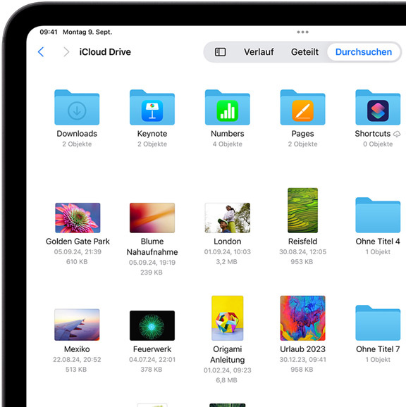 iCloud Drive sorgt dafür, dass die Dateien und Ordner, die du speicherst, leicht zu finden und zu teilen sind, egal welches Gerät du nutzt. Greif auf alles über die Dateien App in iOS und iPadOS, den Finder auf deinem Mac, den Datei Explorer für Windows PCs oder iCloud.com zu.
