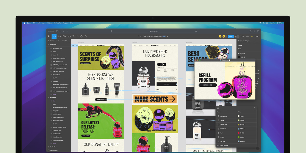 銀色 Mac mini 展示機身前面連接埠,擺放在顯示器下方,螢幕上顯示一張細膩奪目的平面設計圖,表達 Mac mini 配備 M4 和 M4 Pro 的強勁 GPU 效能。