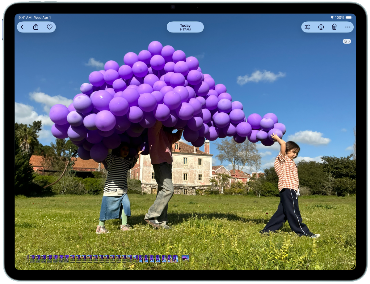 Pejzažni prikaz iPada Air uz Apple Intelligence i alat Čišćenje u aplikaciji Fotografije