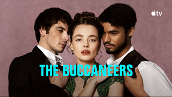 Apple TV 4K, két HomePod és egy síkképernyős tévé, amelynek képernyőjén A hadvezér című sorozat látható