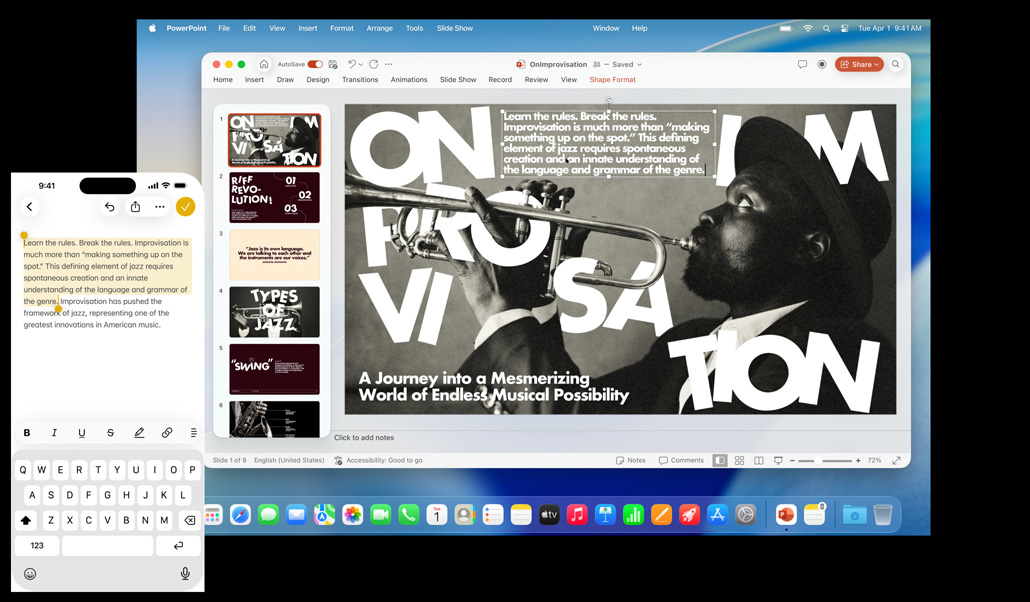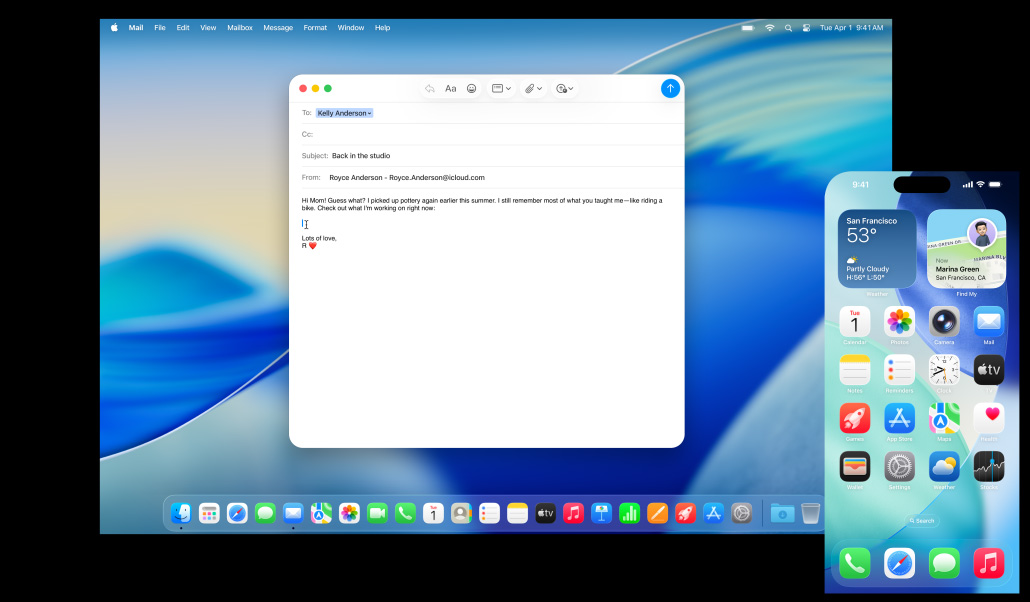 Mac, iPhone, iPad, dan Apple Watch luar biasa saat bekerja sendiri. Dan semakin mengagumkan saat digunakan bersama. Berkat Kontinuitas, perangkat Anda bekerja sama dengan mulus — memungkinkan berbagai fitur yang andal. Mulai email di Mac dan selesaikan di iPad Anda. Ambil foto di iPhone dan lihat foto itu muncul di Mac Anda. Atau lakukan panggilan tanpa menyentuh iPhone Anda.1 Nikmati keajaiban Kontinuitas.