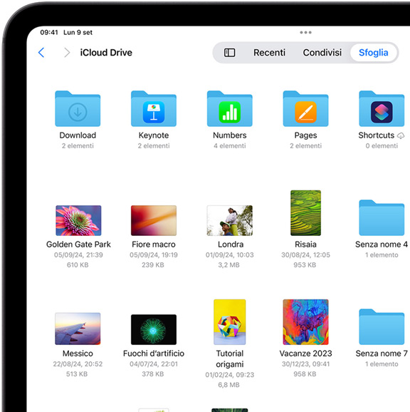 Con iCloud Drive, i file e le cartelle che salvi nella nuvola sono sempre a portata di mano su tutti i tuoi dispositivi, e sono anche facilissimi da condividere. Puoi aprirli dall’app File su iOS e iPadOS, dal Finder sul Mac, da Esplora File sui PC Windows oppure direttamente da iCloud.com.
