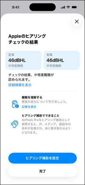 すぐに結果を。シームレスなサポートを。ヒアリングチェックが完了すると、パーソナルプロファイルに結果がわかりやすく表示され、あなたの聴力について詳しく知ることができます。ヒアリングにほぼ不自由のない方や難聴が認められない方でも、特定の周波数がもっとクリアになると聞き取りやすいかもしれません。その場合はメディアアシストの設定を調整して、メディアや通話の音声を補正しましょう。軽度から中程度の難聴が認められる場合は、ヒアリング補助機能の設定を促すメッセージが表示されます。