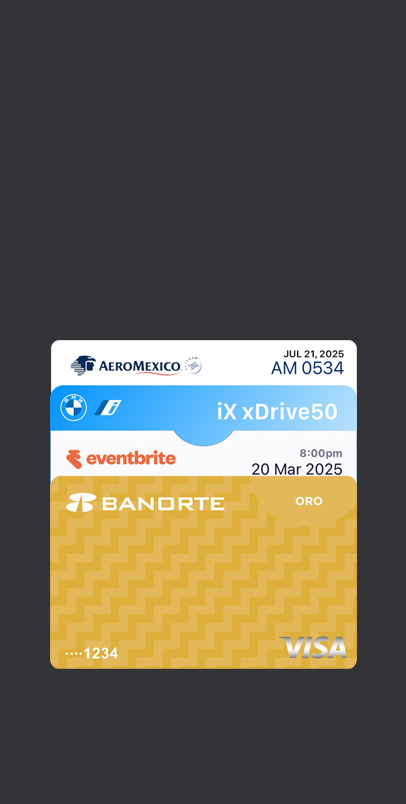 Almacena tus tarjetas de pago, pases de abordar, boletos, llaves de auto y mucho más de forma segura y en un solo lugar.14