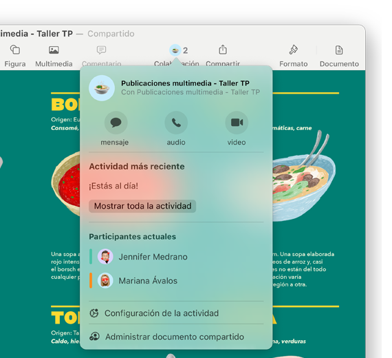 Colabora y comparte fácilmente archivos, carpetas, documentos y mucho más aunque estés del tingo al tango. Sólo tienes que enviar un enlace privado y configurar los ajustes si quieres que los demás vean, compartan o editen el contenido. Y gracias a las actualizaciones en vivo, podrás ver las modificaciones que se vayan haciendo en tiempo real.