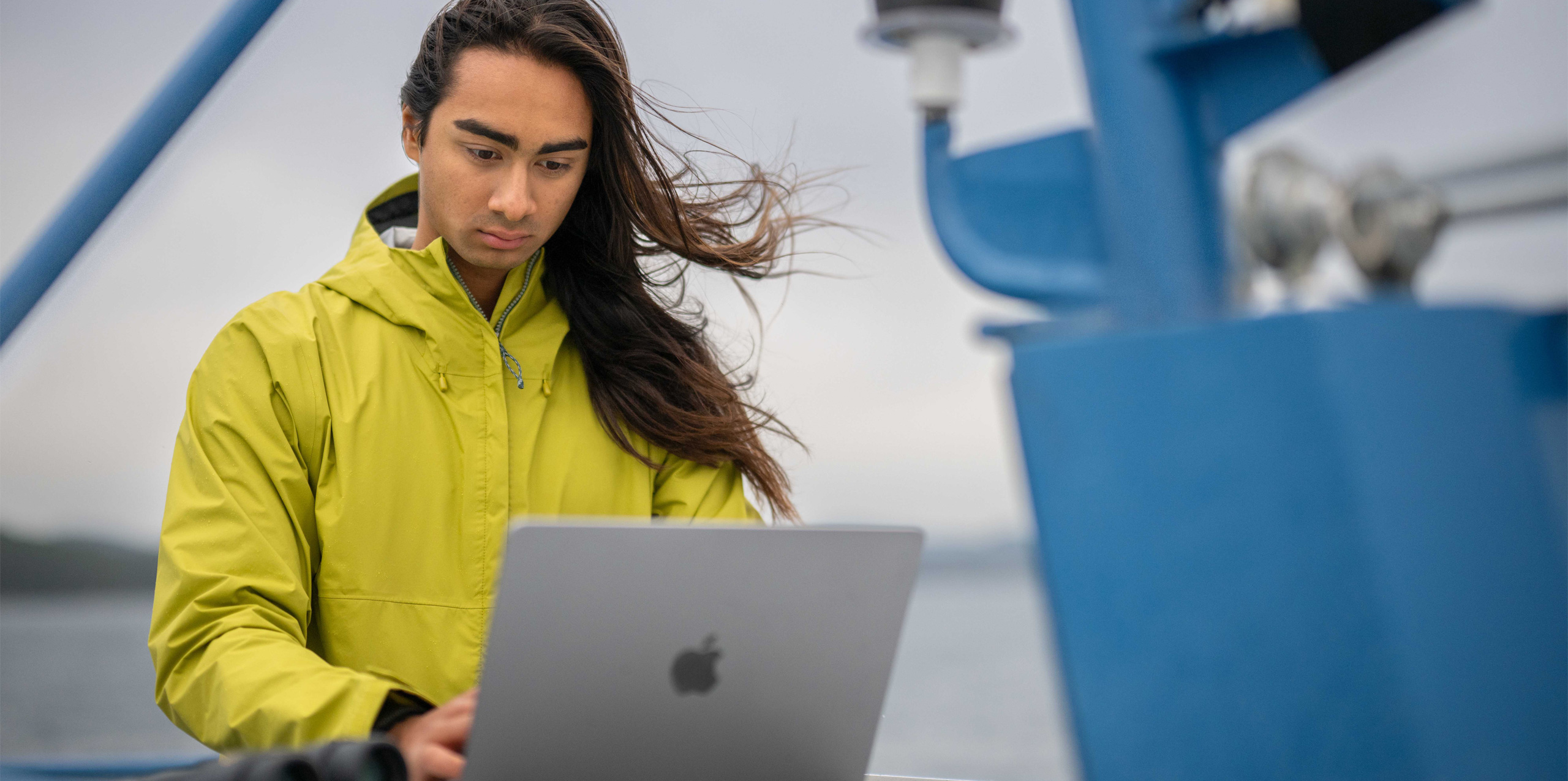 Apple technologie helpt Bodhi ook bij het uitvoeren en samenstellen van zijn universitaire onderzoek. Een voorbeeld hiervan is het illustreren van de impact die de activiteiten van zeeschepen hebben op de bedreigde populatie van Southern Resident orka’s in de Salish Sea. Op het water gaat hij aan de slag met het veldwerk voor zijn project, waarvoor hij zijn MacBook Air, iPhone en verrekijker meebrengt. Hij brengt walviswaarnemingen in kaart met behulp van Numbers en Keynote om stroomdiagrammen en densiteitskaarten te maken die laten zien waar de locaties populaire veerbootroutes doorkruisen. Dit helpt bij het identificeren van mogelijke verstoringen van inheemse walvispopulaties. Daarnaast maakt hij prachtige foto’s en video’s met zijn iPhone die zijn bevindingen vastleggen.