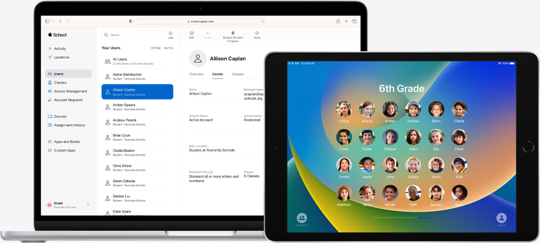 Po wdrożeniu urządzeń dział IT może używać usługi Apple School Manager i rozwiązań MDM do zdalnej konfiguracji, zarządzania dziesiątkami ustawień oraz szybkiego kupowania i udostępniania aplikacji i książek.