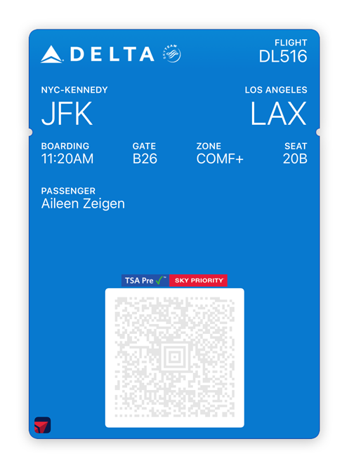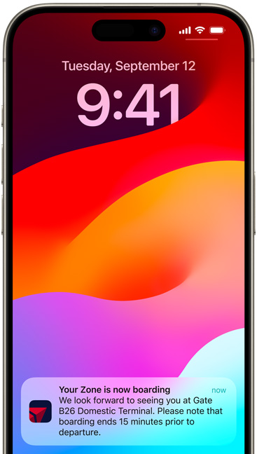 • من السهل استخدام بطاقات مختلفة في تطبيق المحفظة من Apple. وقد يظهر بعضها تلقائياً بحسب الوقت والموقع، مثل بطاقة صعود الطائرة التي تظهر لك فور وصولك إلى المطار.