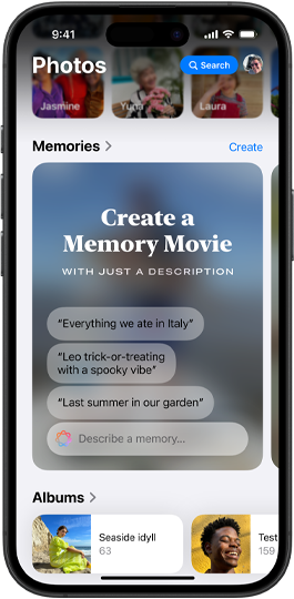 Skapa en egen minnesfilm av berättelsen som du vill se, direkt i Bilder. Ange en beskrivning så letar Apple Intelligence upp de bästa bilderna och videorna som stämmer in på den. Den skapar sedan en berättelse med unika kapitel utifrån de teman den hittar och ordnar dina bilder till en film med början, mitt och slut.