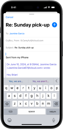 Använd ett Smart svar i Mail för att snabbt svara på mejl med all information som behövs. Apple Intelligence kan identifiera vilka frågor som du fick i mejlet och erbjuda relevanta alternativ som du kan ta med i ditt svar. Med några få tryck är du redo att skicka ett svar med de viktigaste frågorna besvarade.