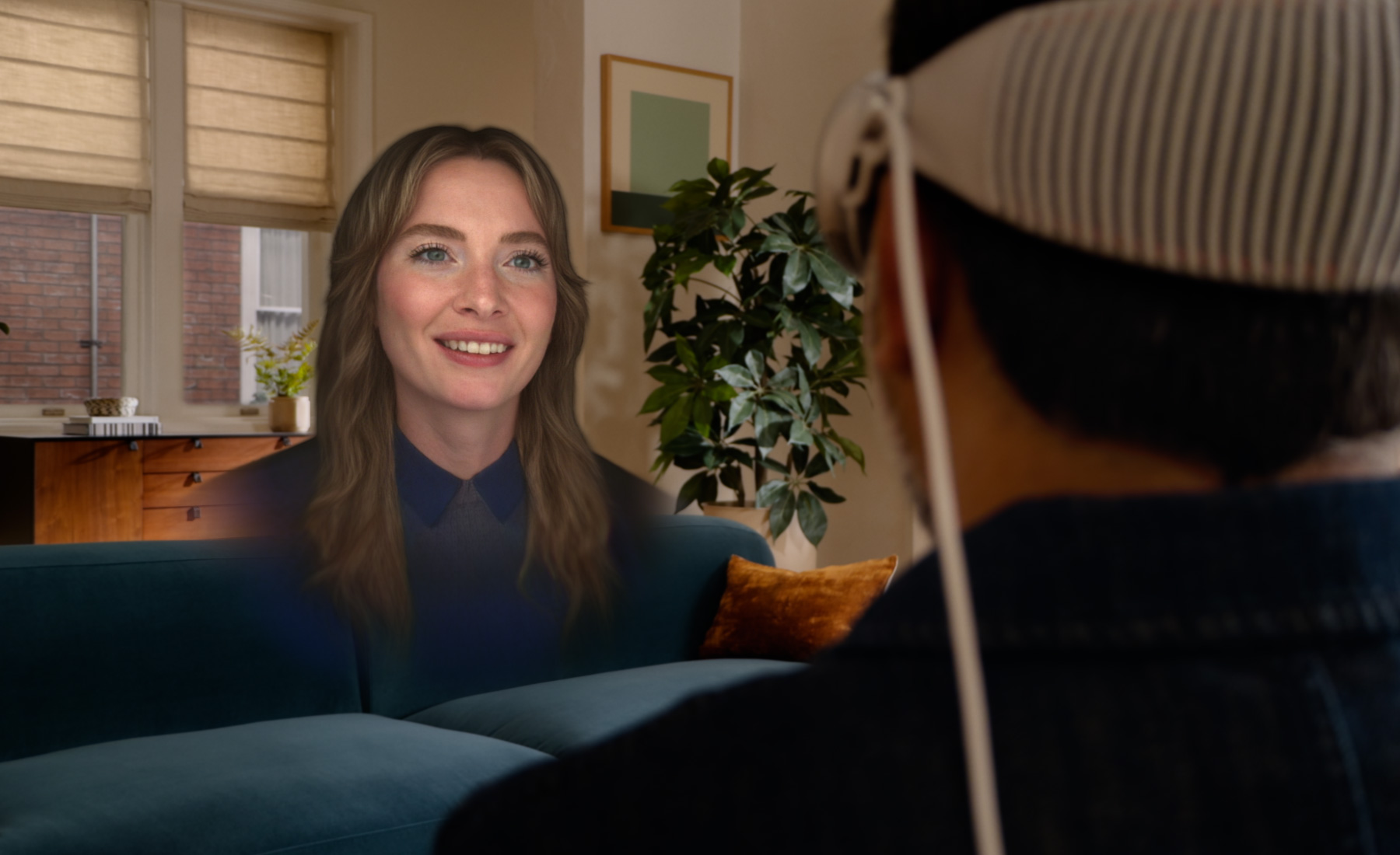 In FaceTime, each participant appears in your space within a tile that you can adjust in scale. Spatial Audio makes the conversation feel more natural by placing each person’s voice in the location of their tile.