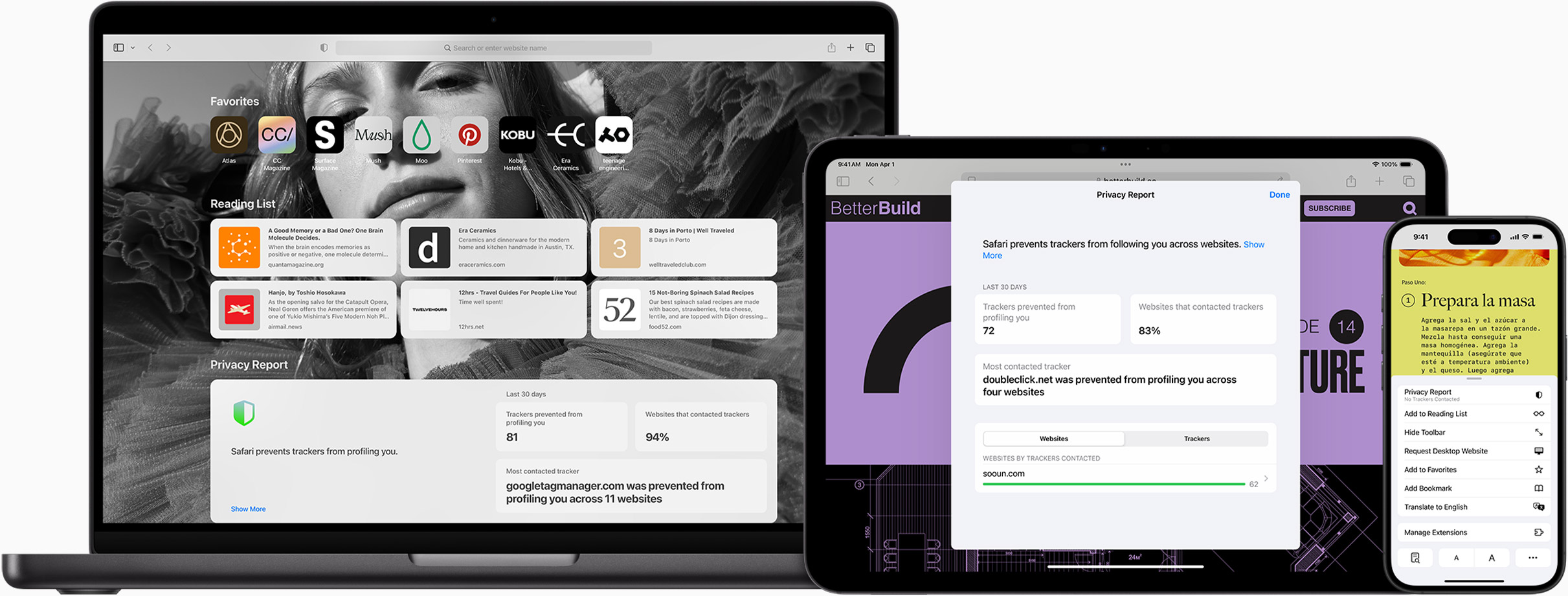 Safari makes it simple to see how your privacy is protected on all the websites you visit. Click Privacy Report in the Safari menu for a snapshot of cross-site trackers currently prevented from profiling you on the website you’re visiting. Or view a weekly Privacy Report to see how Safari protects you as you browse over time.