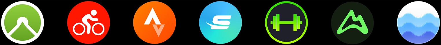 Gösterilen uygulamalar: Komoot, MapMyRide, Strava, Swim.com, SmartGym, AllTrails, Tides, MySwimPro, Gaia GPS, Nike Run Club, Palisades, Paddle Logger, Oceanic+ ve Slopes.