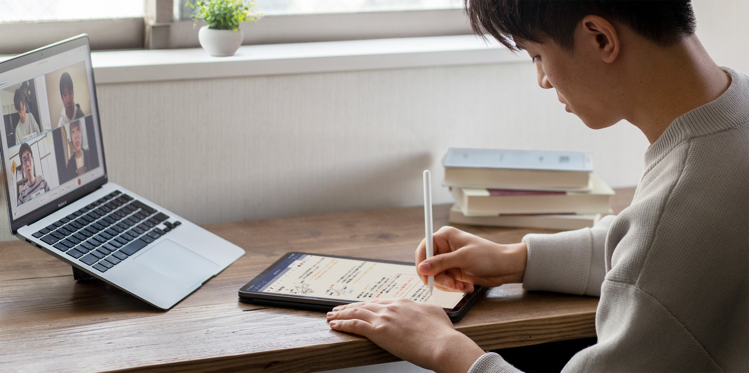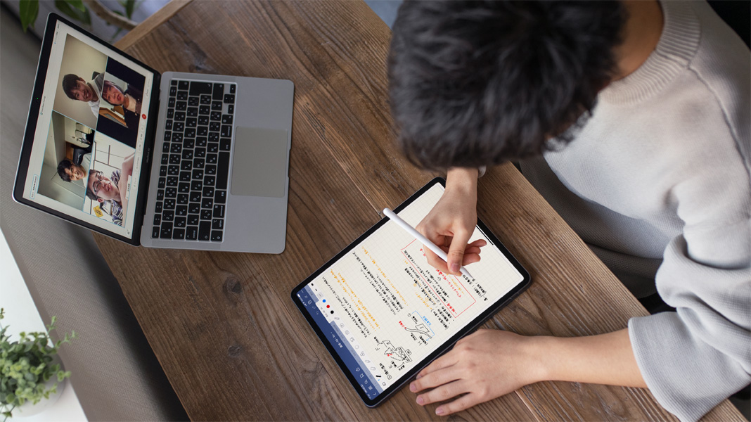 Takuto 和許多學生一樣,透過尖端科技來適應遠距學習。在線上授課期間,他使用 iPad 上的「分割螢幕」功能,一邊看著教授的簡報,一邊寫筆記。在虛擬學習小組中,Takuto 使用 Mac 上的 FaceTime 聯繫同學,同時利用 iPad 上充滿沈浸式體驗的畫布來記錄小組計畫案內容。