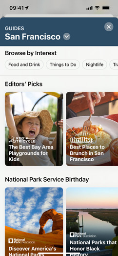 Guides help you find amazing things to see and do in cities around the world.5 Just tap the Explore Guides button to access nearly 1,000 expertly curated Guides, and find and save the ones that catch your eye. Curated Guides automatically update when new places are added, so you always have the latest recommendations at your fingertips. You can also create your own Guides and share them with friends and family.